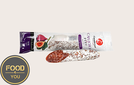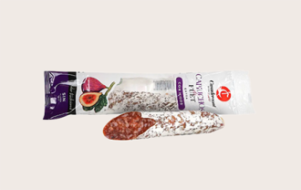 Ковбаса Фует Міні з інжиром 80 г в/у – це вишуканий делікатес, що поєднує в собі традиційний іспанський фует і солодкі нотки натурального інжиру. Виготовлена з добірного м’яса з додаванням прянощів, ця ковбаса проходить процес природного дозрівання, що надає їй характерного смаку, щільної текстури та благородної білої плісняви на поверхні. Інжир додає легку фруктову солодкість, яка гармонійно підкреслює смак м’яса. Ідеально підходить для сирних тарілок, закусок або як оригінальне доповнення до вина. Вакуумне пакування 80 г зручно для зберігання та використання.