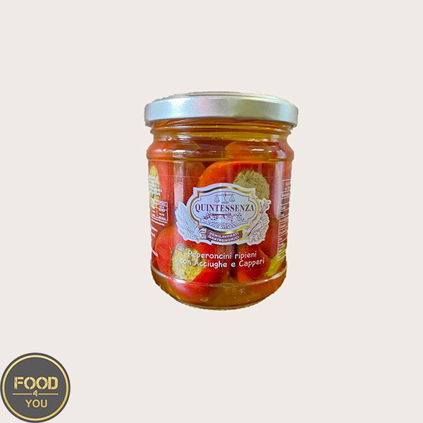Перець Quintessenza, фарширований анчоусом з каперсами — це справжній делікатес для поціновувачів середземноморської кухні. Соковитий маринований перець наповнений пікантною начинкою з анчоусів, доповненою ароматними каперсами, що додають страві характерного смаку та витонченості. Такий продукт ідеально підходить як закуска до вина, частина антипасті або оригінальне доповнення до салатів. Упаковка 180 г — зручний формат для сервірування на святковому столі чи несподіваного гастрономічного задоволення вдома. Quintessenza — це смак, що переносить прямо на узбережжя Італії.